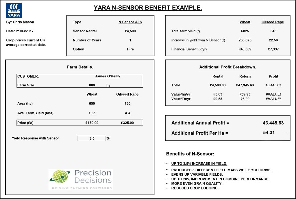 A calculation sent to James at the time he placed the order suggested that by applying his N variably across his 800ha farm James could see an additional on-farm profit in excess of £43,000 at yield responses of just 3.5%