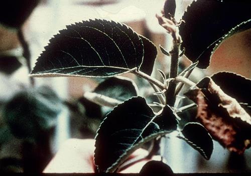 Terminal buds die off. The youngest leaves first turn slightly chlorotic, then margins become scorched and roll inwards.