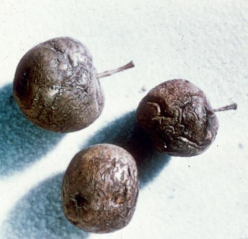 Fruits are small and deformed and necrotic with sunken areas which give a dimpled appearance