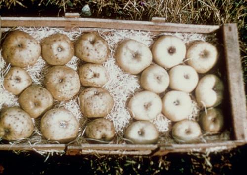 Fruits with boron deficiency (left hand side) compared with healthy fruits.