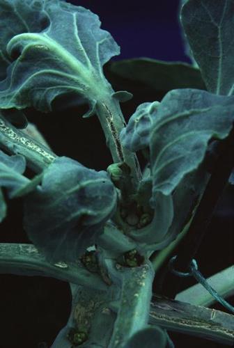 Boron deficiency leads to scarred and corky spots on petioles and stems. Leaves are brittle and deformed. Petioles may show cracks.