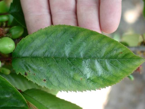 In cherries, the youngest leaves are an olive green and if subjected to severe manganese shortage, the margins turn purplish brown.