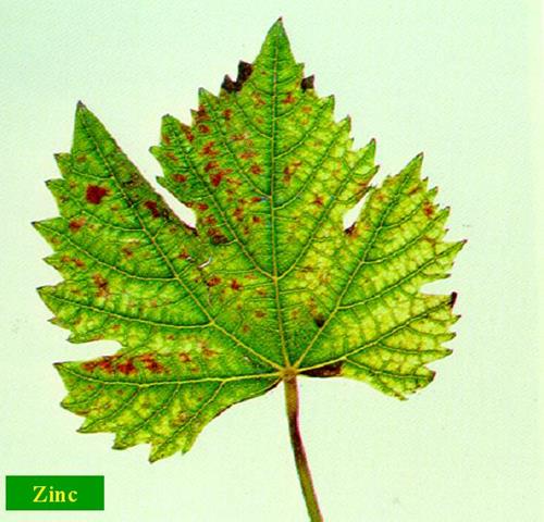 Symptoms of zinc deficiency appear on young leaves first. A light green, mosaic-like chlorosis appears in the interveinal areas and continues to pale over time. Along the veins, a dark green border remains.