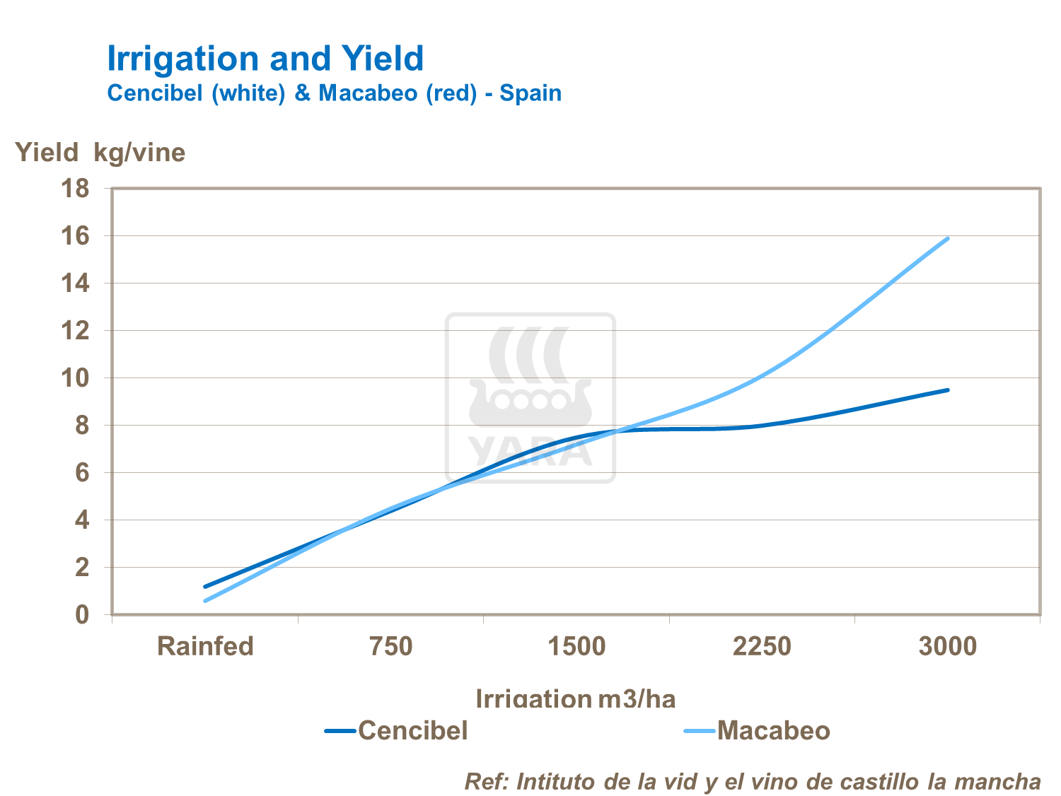 In the same Spanish trials, irrigation had no effect on °Baumé in white grapes, but reduced °Baumé in red wine grapes. The pH of the wine was also reduced, but there was no effect on wine color. Recent trials by Yara Iberia have shown similar effects.