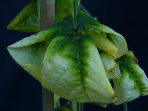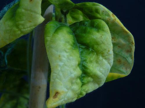 Already far advanced chlorosis. The leaf is almost completely bleached, only the leaf base, the midrib and its adjacent area are still green.